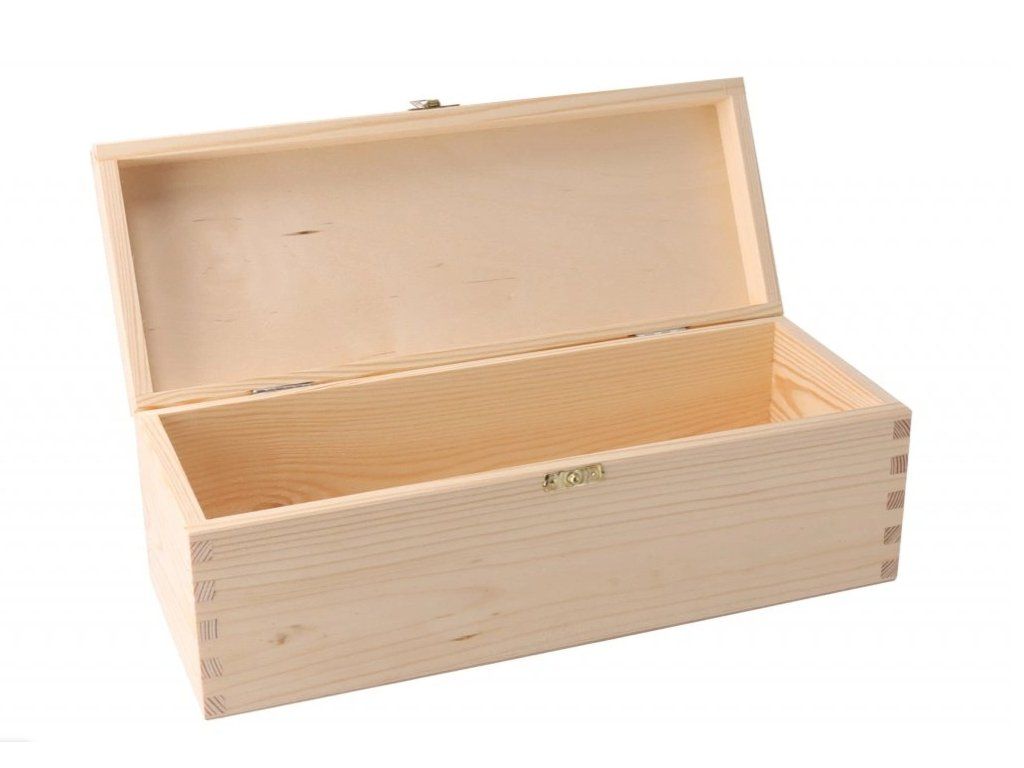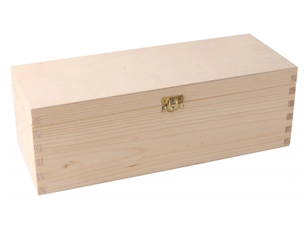 Dřevěná krabice na šampaňské. Délka 38 cm, výška 12 cm a šířka 14 cm.