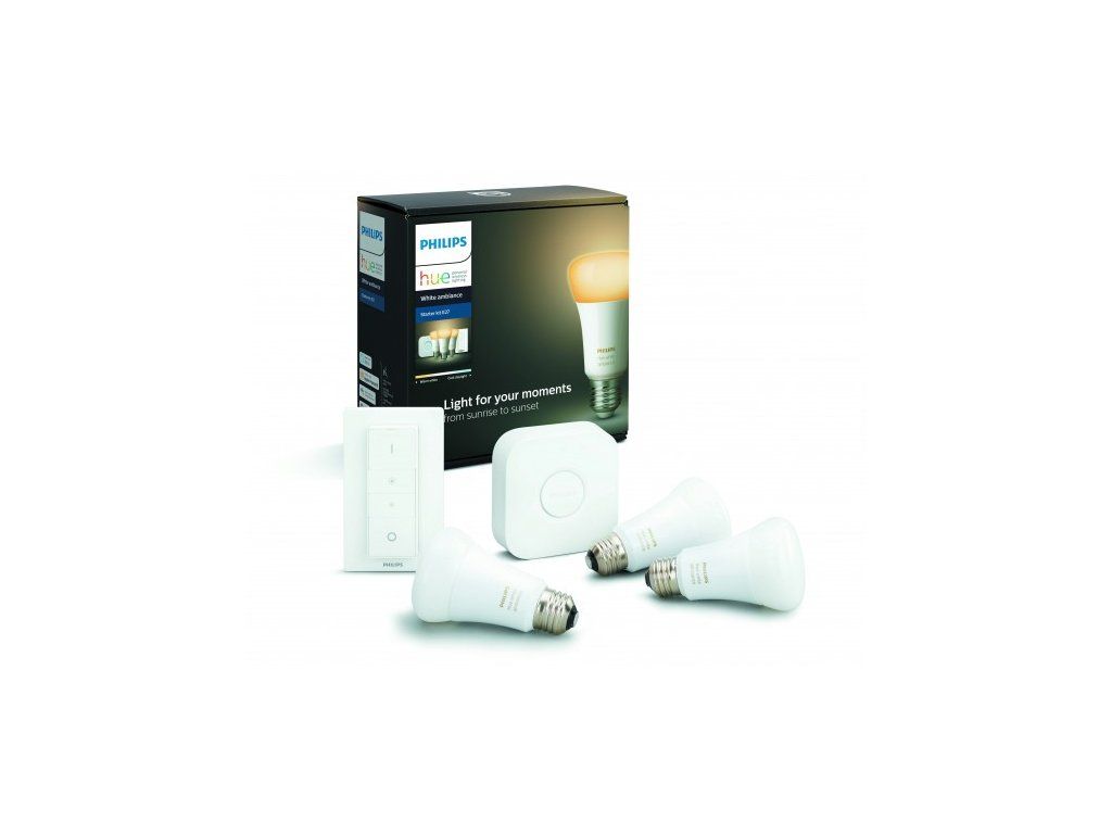 Základní startovací set Philips Hue obsahuje můstek Hue Bridge, dálkové ovládání Hue Dimmer Switch a 3 ks úsporných chytrých stmívatelných LED žárovek Philips Hue White Ambiance.