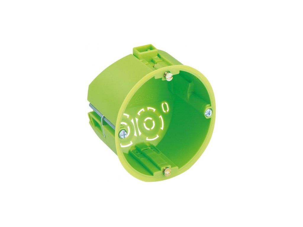 Krabice do dutých stěn, samozhášivá, univerzální krabice pro tloušťku desek 1 až 40 mm, s integrovaným patentovaným spojovacím můstkem, včetně děrovacího nástroje, rozteč šroubů pro montáž přístrojů 60 mm.