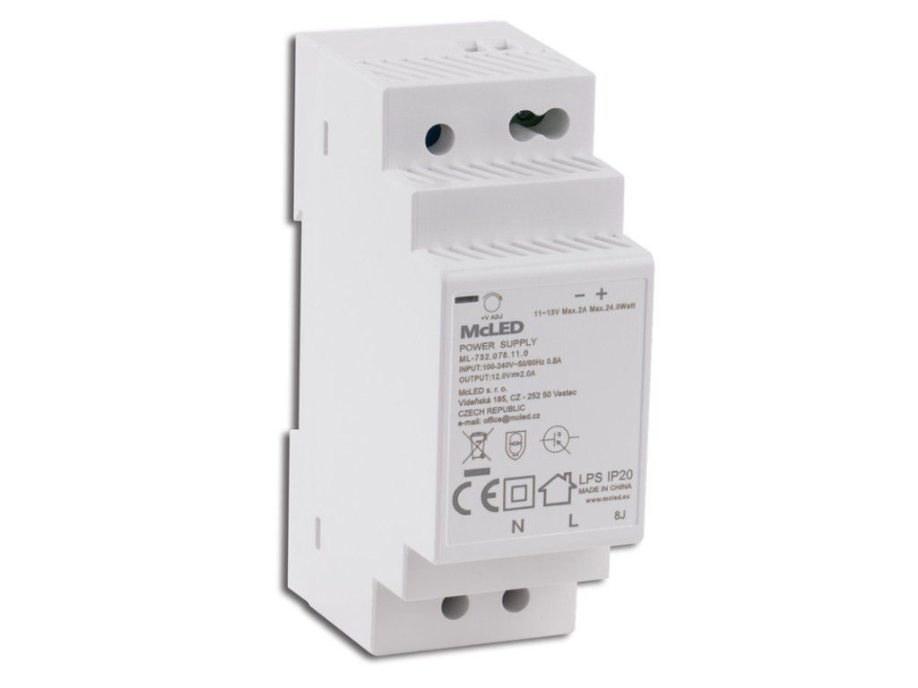LED napěťový zdroj pro LED pásky 24W, výstup DC 12V/2A. Možnost regulace výstupního napětí: 11-13V. Pro montáž na DIN lištu (DIN TS-35/7,5 a DIN TS-35/15). Vstup 100-240V AC, 0,8A.