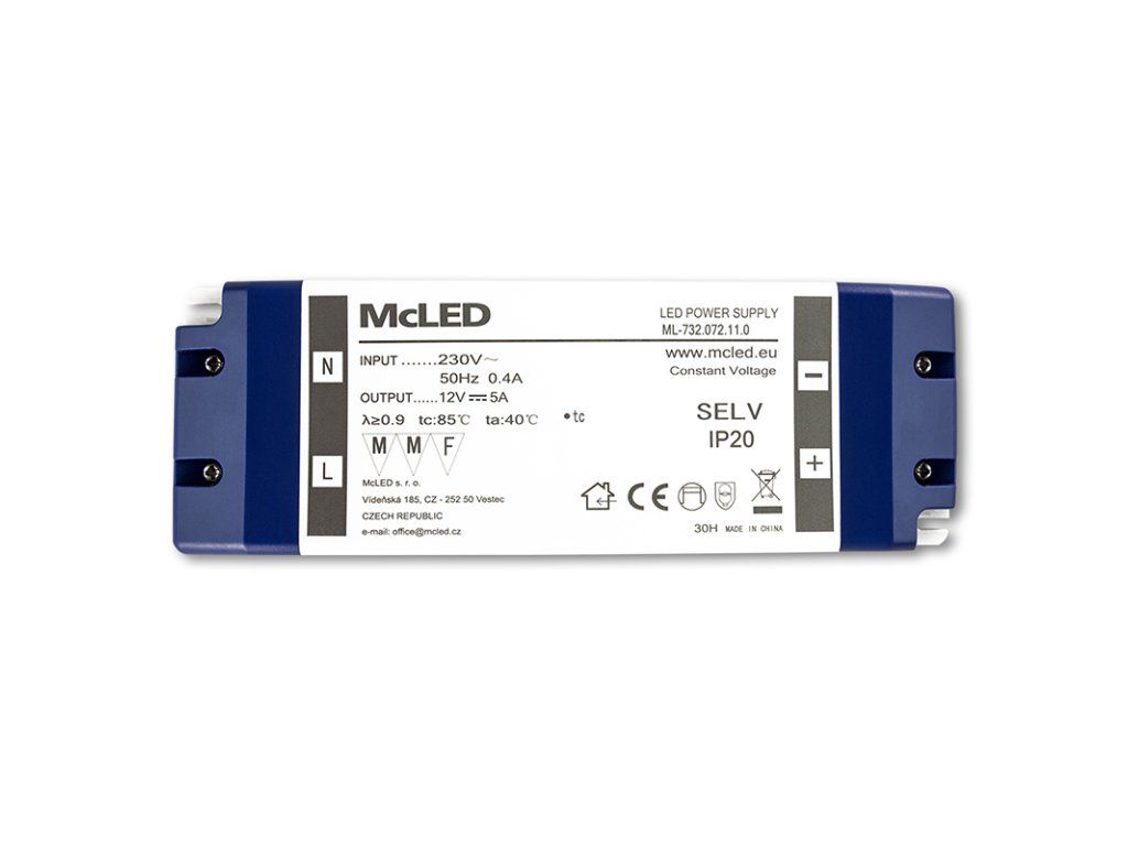 LED napěťový zdroj pro LED pásky 60W, výstup DC 12V/5A. IP20. Vstupní a výstupní svorkovnice. Vstupní napětí 220 - 240V AC