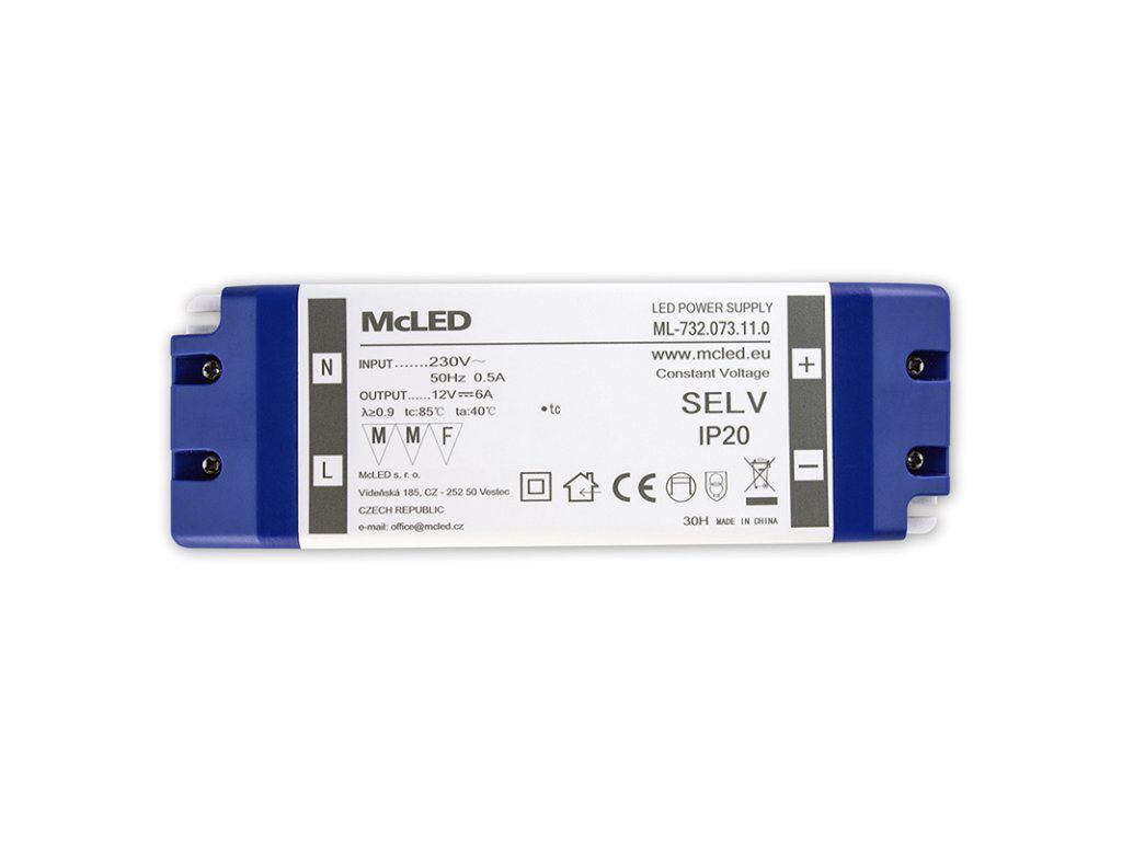 LED napěťový zdroj pro LED pásky 72W, výstup DC 12V/6A. IP20. Vstupní a výstupní svorkovnice. Vstupní napětí 220 - 240V AC