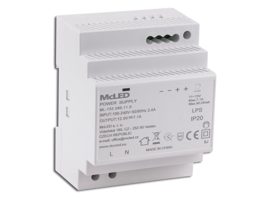 LED napěťový zdroj pro LED pásky 90W, výstup DC 12V/7,1A. Možnost regulace výstupního napětí: 11-13V. Pro montáž na DIN lištu (DIN TS-35/7,5 a DIN TS-35/15). Vstup 100-240V AC, 2,4A.