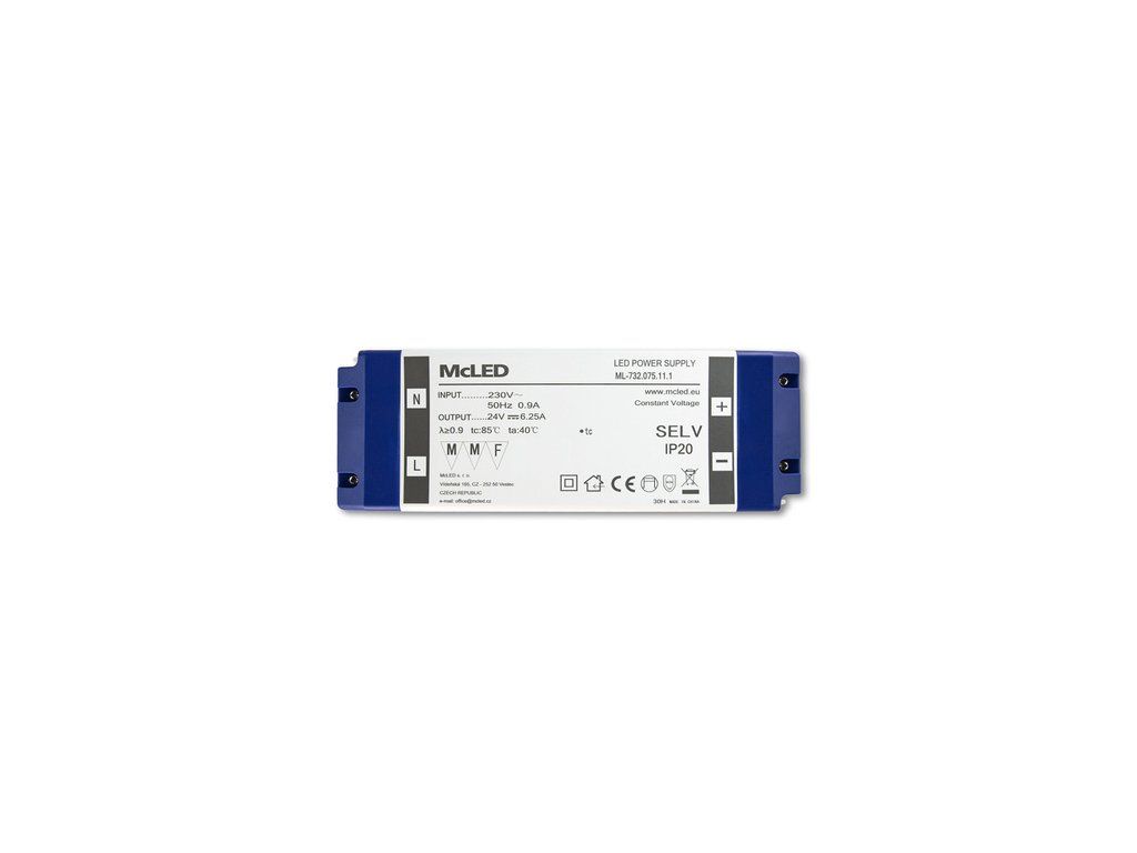 LED napěťový zdroj pro LED pásky 150W, výstup DC 24V/6,25A. IP20. Vstupní a výstupní svorkovnice. Vstupní napětí 220 - 240V AC, materiál krytu: plast, barva bílá. Rozměry 205x71x35mm, hmotnost 0,59kg. Zdroj SELV, certifikáty: CE, RoHS, MM, F. Při výběru zdroje počítejte s výkonovou rezervou min. 20%.Doplňkové parametry