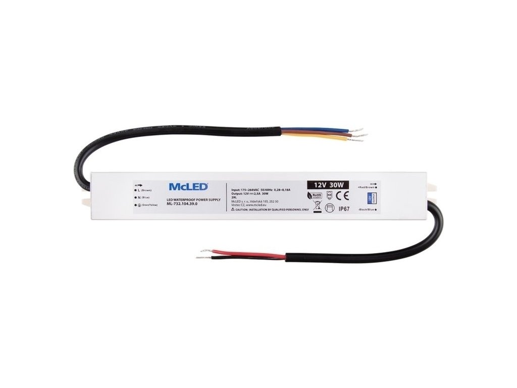 Zdroj konstantního napětí, výkon 30W, krytí IP67, výstup: 24VDC, max. 1,25A. Vstup: 175-264VAC, 50-60Hz, materiál krytu: hliník. Rozměry: 188x29x20mm, hmotnost: 226g. Zdroj SELV. Při výběru zdroje počítejte s výkonovou rezervou min. 20%.Doplňkové parametry
