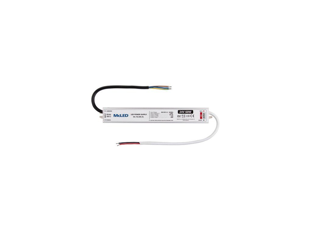 LED napěťový zdroj pro LED pásky 60W, krytí IP67, výstup 24VDC, max. 2,5A. Vstup: 200-250VAC, 50-60Hz, 0,46A, materiál krytu: hliník. Rozměry: 220x30x21mm, hmotnost: 270g. Zdroj SELV. Při výběru zdroje počítejte s výkonovou rezervou min. 20%.