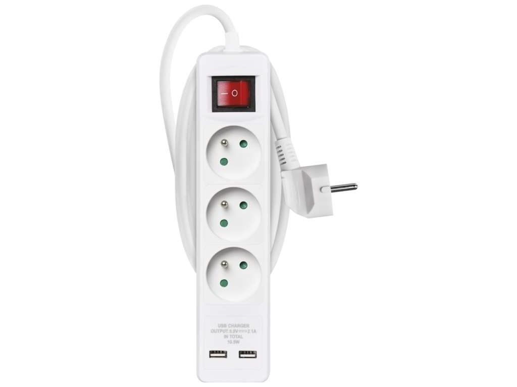 Prodlužovací kabel s vypínačem – 3 zásuvky + 2 USB, 2m, bílý