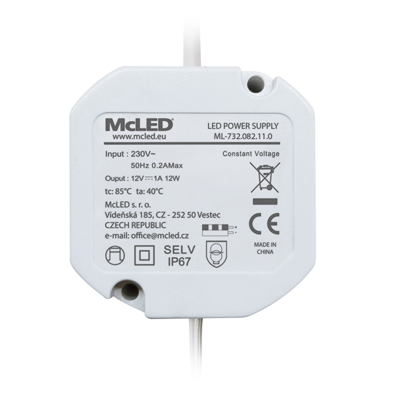 LED napěťový zdroj pro LED pásky, výstup DC 12V/1A. Vhodný pro montáž do el.instalační krabice. Vstupní napětí 230V AC.