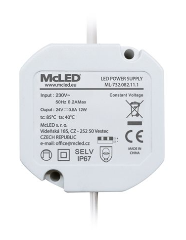 Napájecí zdroj pro LED pásky, montáž do elektroinstalační krabice, krytí IP67, výkon 12 W a napětí 24 V DC, McLED