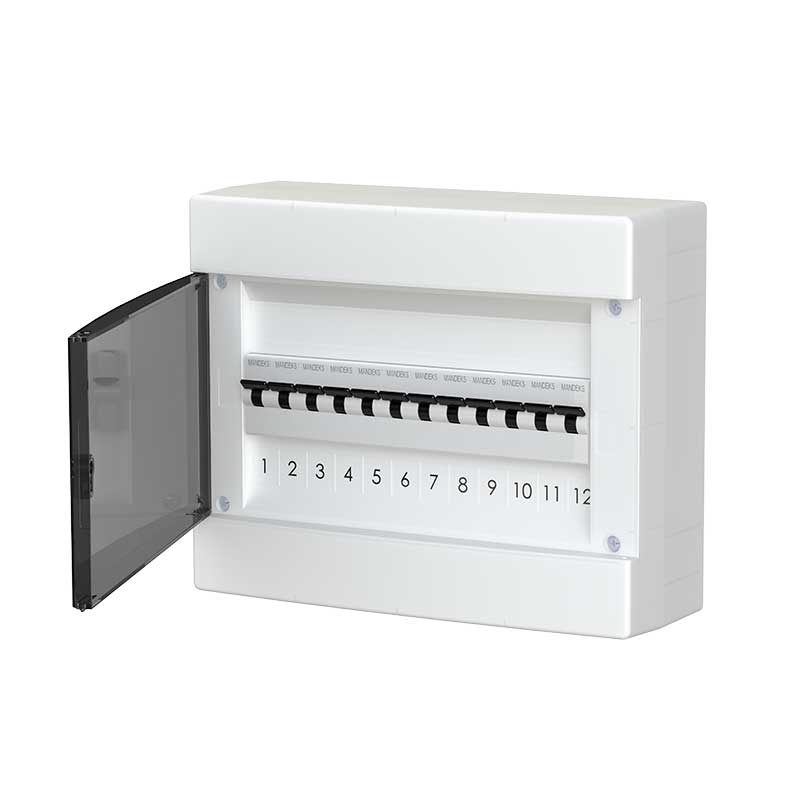 Nástěnná rozvodnice série DINAMIC s prostorem pro osazení jistících prvků. Rozvodnice s 12 moduly DIN, krytí IP40, bílá skříň, transparentní dveře, svorkovnice N/PE.
