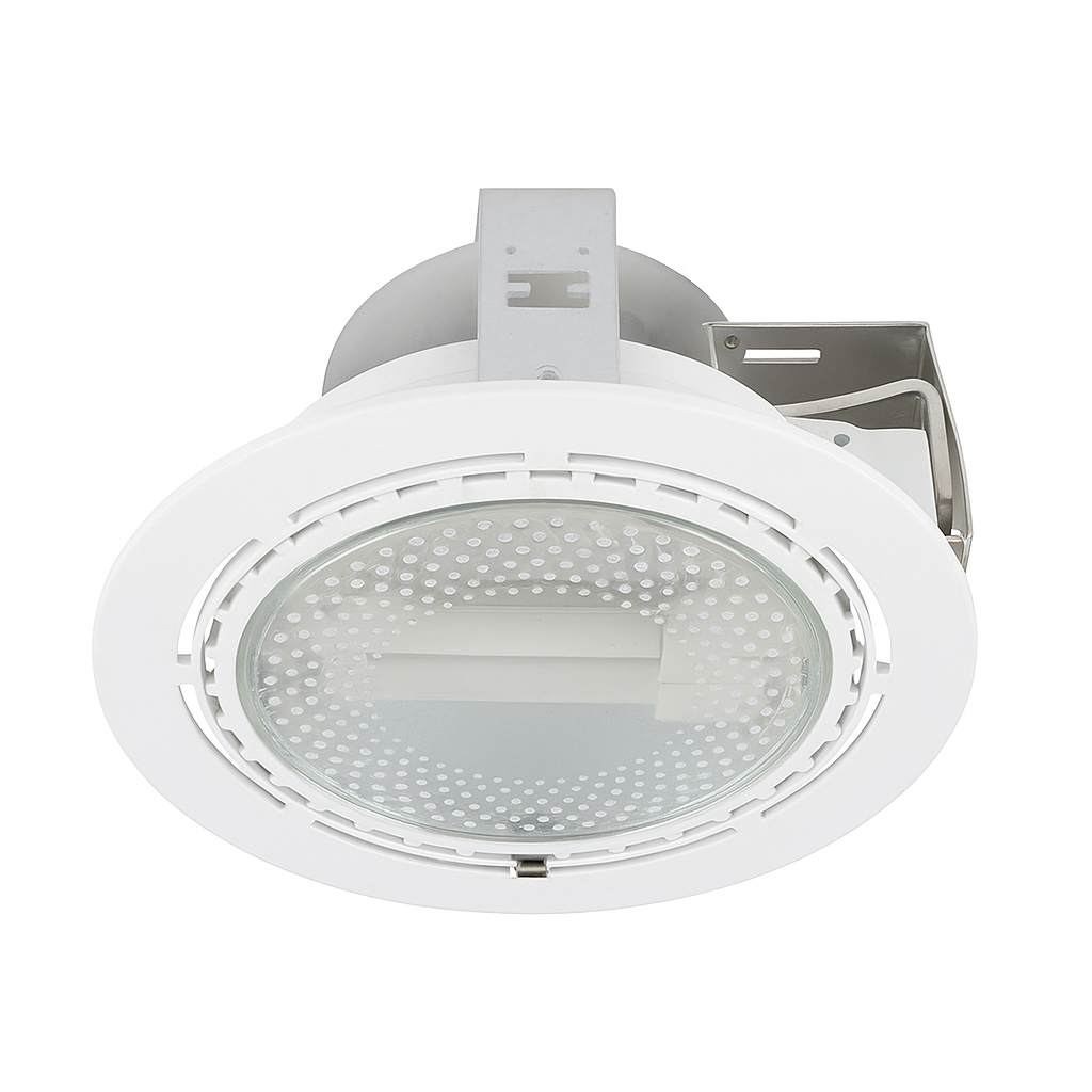 Jedná se o vestavné stropní svítidlo s kulatým bílým rámečkem a krycím sklem s jemnou perforací, které zajišťuje rovnoměrné rozptýlení světla. Svítidlo je určené pro dvě zářivky 26 W, celkově poskytuje dostatečný světelný výkon pro interiérové prostory. Díky jednoduchému a čistému designu se hodí do kanceláří, obchodních prostor i chodeb. Konstrukce umožňuje snadnou montáž do podhledu.
