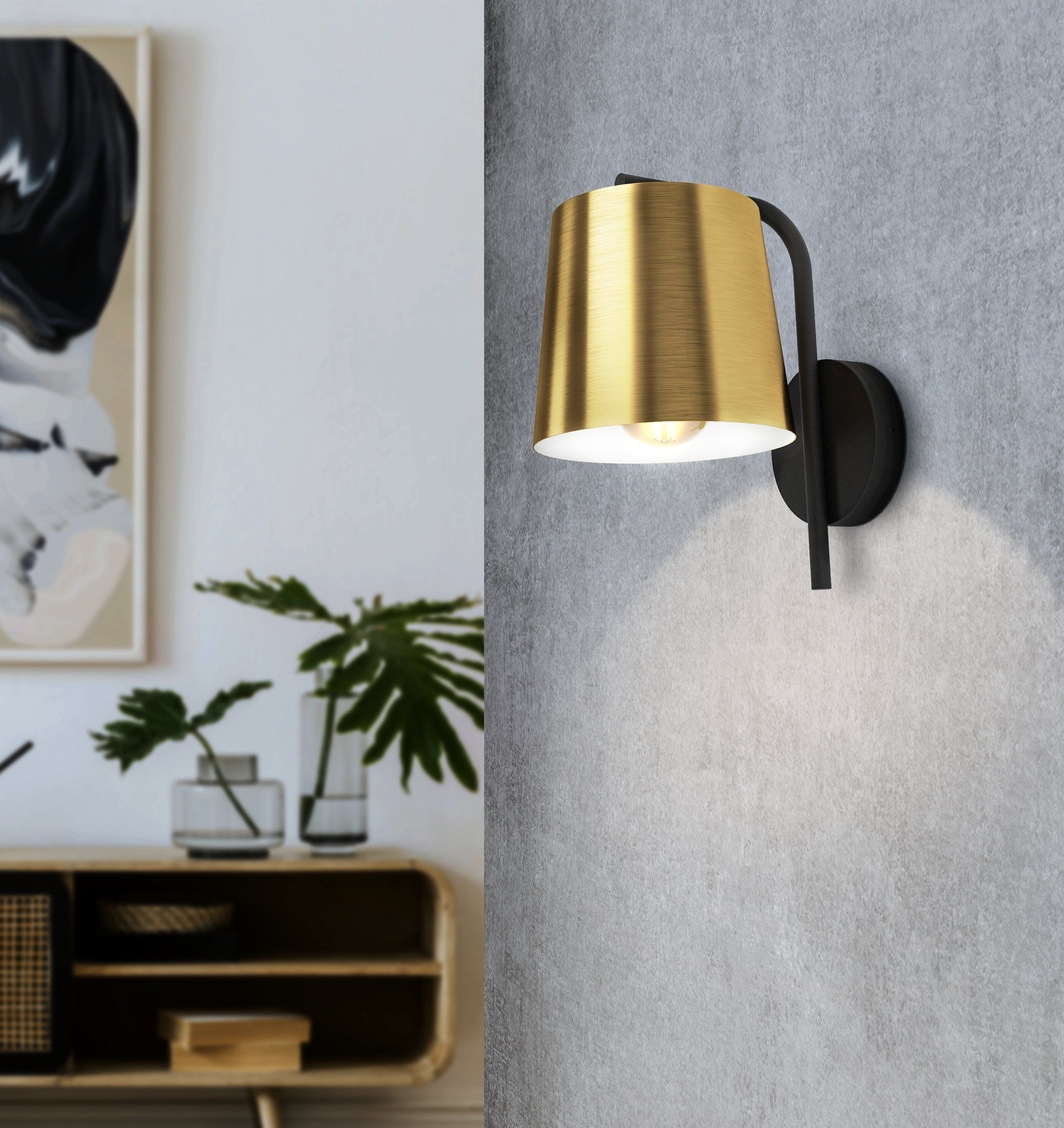 EGLO Krela nástěnné svítidlo E27 60 W – matný brass s černými doplňky je stylové interiérové světlo v kombinaci elegantního matného mosazného povrchu a kontrastní černé základny. Je vybaveno objímkou E27 pro klasickou žárovku až do 60 W (žárovka není součástí balení). Svítidlo vhodně doplní moderní i industriální styl interiéru – ideální jako dekorativní nástěnné osvětlení do chodby, obýváku nebo nad toaletní zrcadlo.
