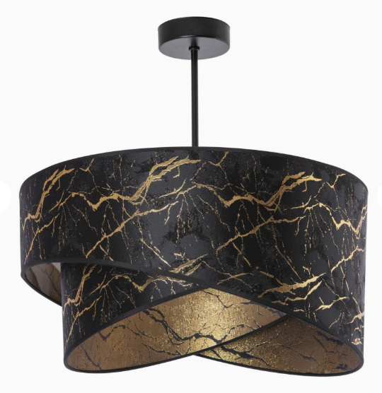 Závěsný lustr s textilním stínidelm v elegantní zlato-černé kombinaci, vhodný nad stůl.