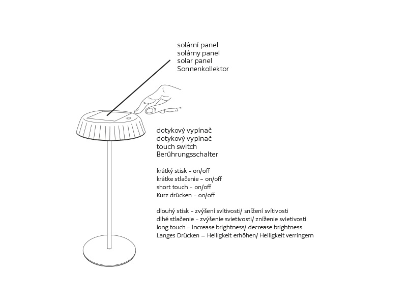 Venkovní solární stmívatelná lampička v bílém a černém provedení s vysokým krytím IP54, autonomií 4h a dobíjením přes USB-C a solární panel. Lampičky lze skrze dotykový spínač na klobouku stmívat: KRÁTKÝ STISK -> zapnutí/vypnutí DLOUHÝ STISK -> zvýšení/snížení svítivosti Materiál: hliník Barva světla: 2700K Svítivost: 180lm Vyzařovací úhel: 100° Výdrž baterie: 4h Doba nabíjení: 3,5h Baterie: LiFePO4 3,2V 1600mAh (není vyměnitelná) LED indikátor baterie Součástí balení je 1m kabel USB-C. Součástí balení není adaptér.