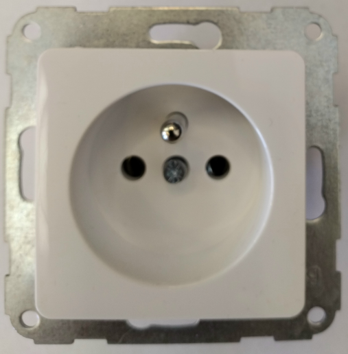 Zásuvka Hager Optima jednonásobná s ochranným kolíkem v lesklé bílé barvě, včetně montážního rámečku. Nutné doplnit jeddnonásobným rámečkem, nebo je vhodná do více násobného rámečku.