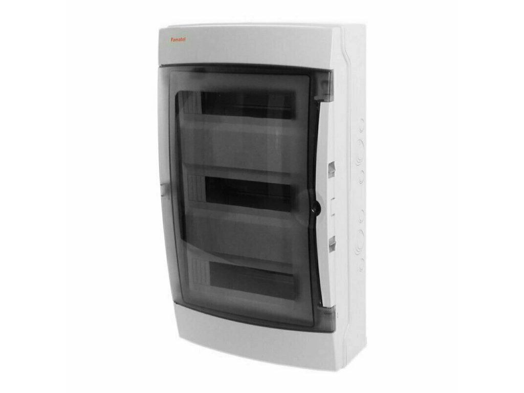 Plastová prostorná rozvodnice ve vyšším v krytí IP65 na povrchovou montáž: FAMATEL ACQUA PLUS 39054 IP65, 54mod. (3x18mod.), šedá/kouřové okénko Hlavní přednosti: Dostatek prostoru pro kabeláž Odnímatelný rám s DIN lištou pro jednoduchou instalaci Samotěsnící membránové průchodky PE/N svorkovnice součástí Dostatek prostoru pro kabely Bezhalogenový materiál (ABS / polykarbonátová dvířka) Možnost osazení kovovým zámkem Plastové rychlošrouby (plombovatelné)Doplňkové parametry