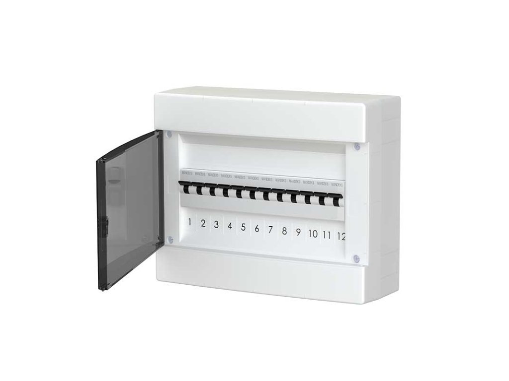 Nástěnná rozvodnice série DINAMIC s prostorem pro osazení jistících prvků. Rozvodnice s 12 moduly DIN, krytí IP40, bílá skříň, transparentní dveře, svorkovnice N/PE.Doplňkové parametry