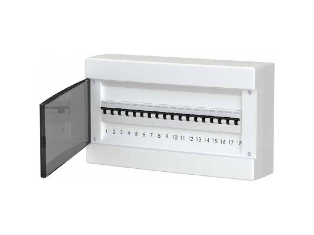 Nástěnná rozvodnice série DINAMIC s prostorem pro osazení jistících prvků. Rozvodnice s 18 moduly DIN, krytí IP40, bílá skříň, transparentní dveře, svorkovnice N/PE. Rozměry 389x225x97mm.Doplňkové parametry