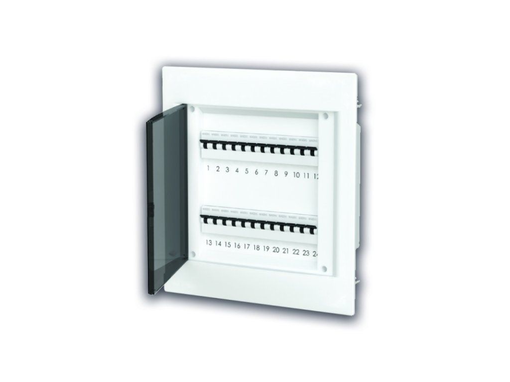 Vestavná rozvodnice pod omítku série DINAMIC s prostorem pro osazení jistících prvků. Rozvodnice s 24 moduly DIN, krytí IP40, bílý rám, transparentní dveře, svorkovnice N/PE.Doplňkové parametry