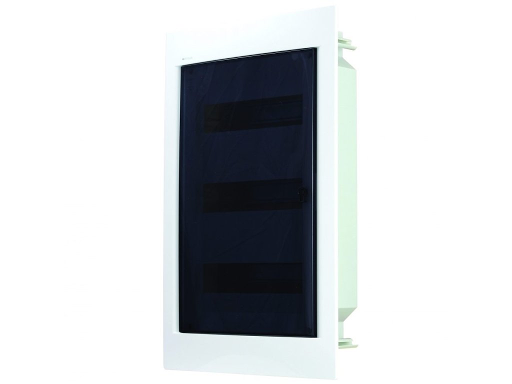 Vestavná rozvodnice pod omítku série DINAMIC s prostorem pro osazení jistících prvků. Rozvodnice s 36 moduly DIN, krytí IP40, bílý rám, transparentní dveře, svorkovnice N/PE.Doplňkové parametry