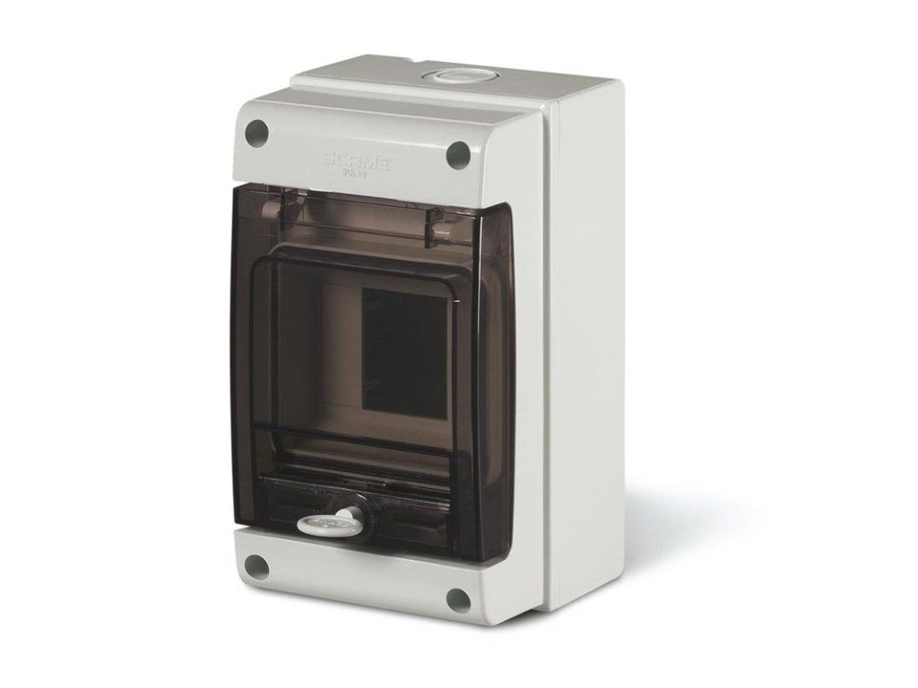 Plastová rozvodnice pro venkovní elektroinstalace s průhlednými dvířky.