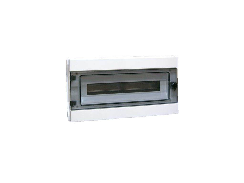 Plastová rozvodnice pro venkovní elektroinstalace s průhlednými dvířky, určena pro venkovní použití.