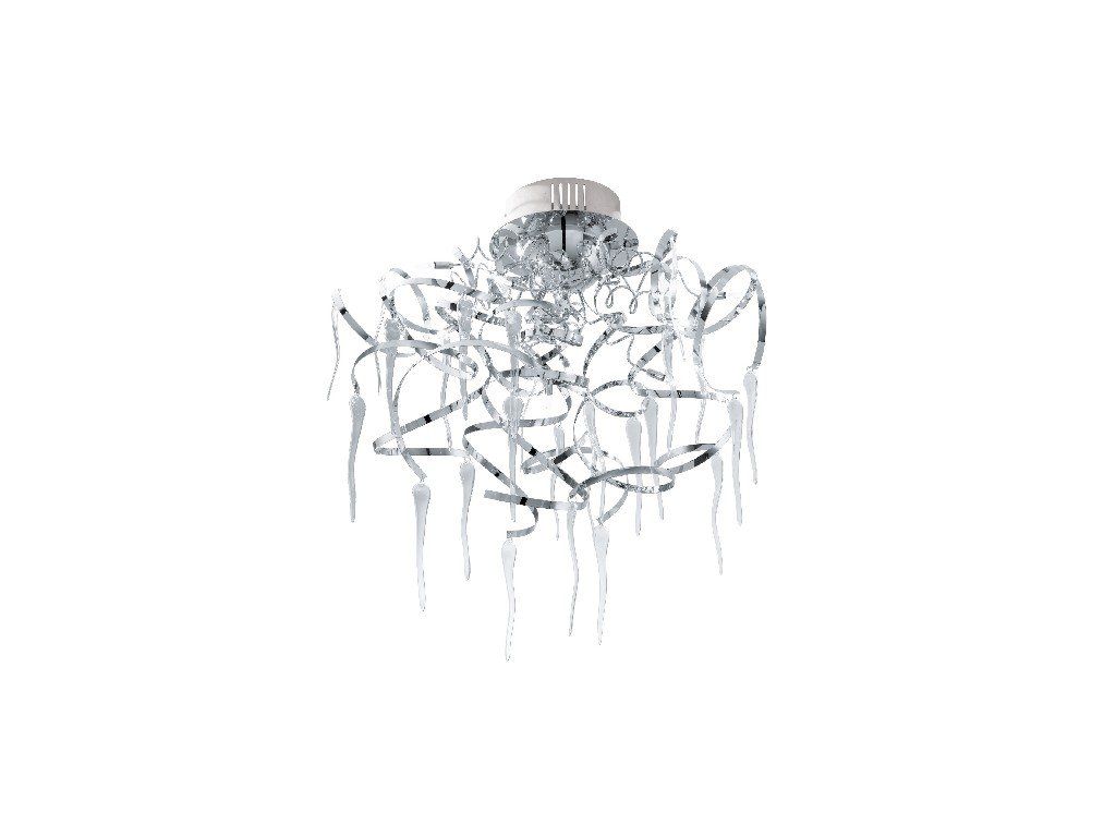 Designové stropní svítidlo se skleněnými ověsky. Povrchová úprava je lesklý chrom, součástí svítidla jsou halogenové žárovky G4.