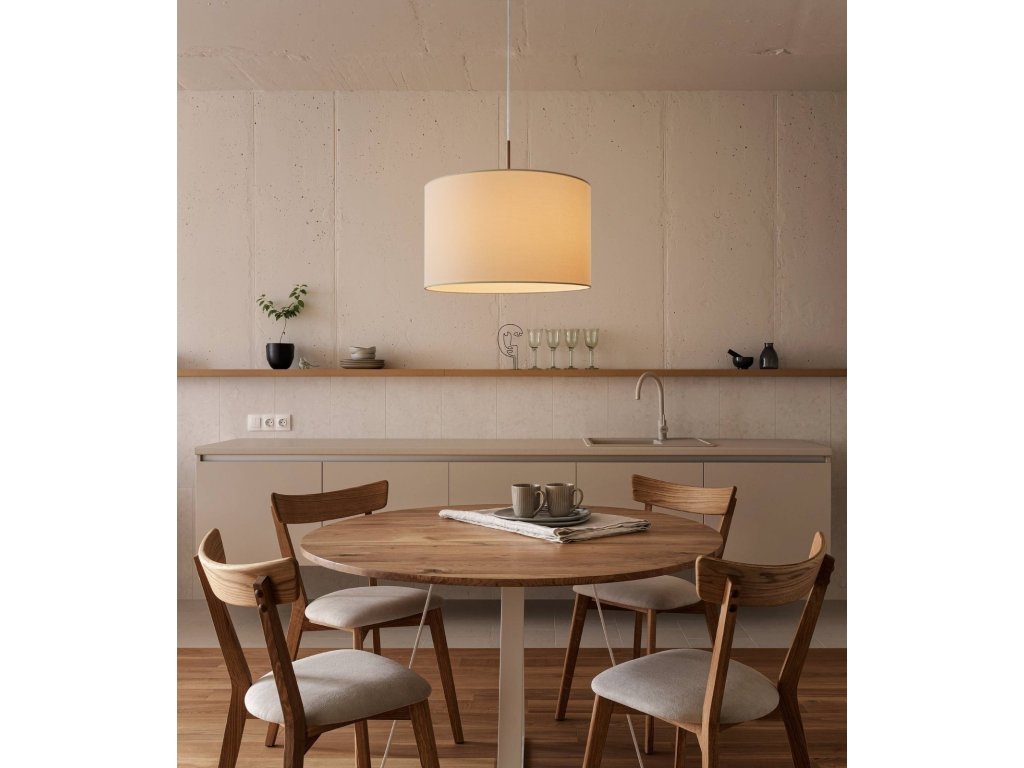 Textilní lustr v bílé barvě působí vzdušně, čistě, elegantně a zároveň moderně. Látka dodává prostoru útulný dojem. Základna a závěs z matného niklu, bílá látka. Ideální např. do ložnice, do dívčích pokojíků nebo do pracovny či knihovny. Průměr 38 cm, výška 110 cm. Žárovku si dokupte s paticí E27, max. 60W.