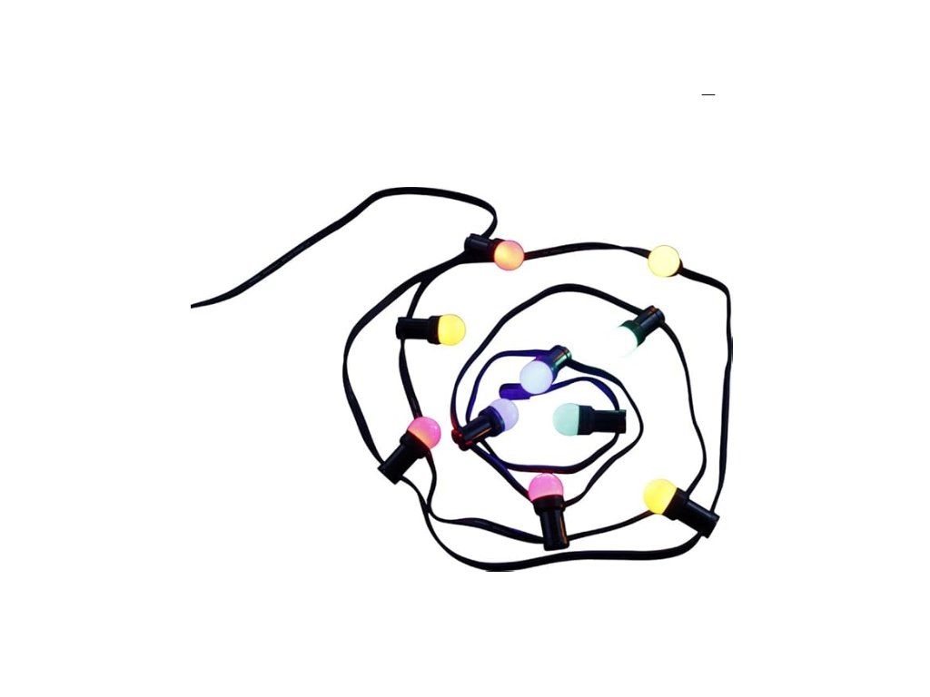 Venkovní girlanda obsahuje 2 x E27 LED 1 W 230 V, zelená, 3 x E27 LED 1 W 230 V, červená, 3 x E27 LED 1 W 230 V, žlutá, 2 x E27 LED 1 W 230 V, modrá.