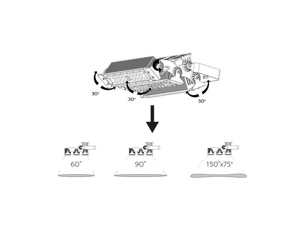 Průmyslový reflektor Úhel vyzařování 60° 3 moduly - úhel vyzařováni lze dle potřeby manuálně nastavit (viz ilustrační obrázek)Doplňkové parametry