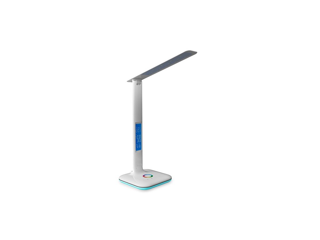 Moderní stolní lampička s dotykovým vypínačem a RGB podsvícením. Podstavec slouží jako noční přisvícení v libovolných barvách RGB - možnost plynulého přepínání barev. Možnost nastavení barvy hlavního světla: 3 režimy svícení (teplá bílá | studená bílá | neutrální). Možnost nastavení intenzity hlavního světla / stmívání. Podsvícený display s časem, budíkem, teplotou a datem.