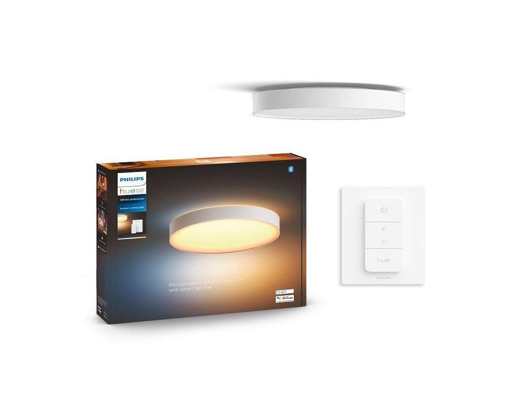 Stropní svítidlo Philips Hue Enrave značky Philips z rodiny Enrave je dostupné ve 2 barvách – bílá a černá. Svítidlo s kruhovou základnou i rám svítidla o průměru 42,5cm je vyrobeno z kvalitního kovu. Difuzor je z odolného bílého plastu a skrývá integrovaný LED zdroj s příkonem 33,5W a inteligentní technologií Hue White Ambiance, díky které lze nastavit barvu světla od 2200K (teplé žluté světlo) do 6500K (studené bílé světlo). Celkový výkon svítidla je 4300 lm. Svítidlo lze ovládat pomocí technologie Bluetooth. Stačí si stáhnout Bluetooth aplikaci, do které lze přidat až 10 inteligentních světel a ovládat je pouhým stisknutím tlačítka na Vašem mobilním zařízení. Svítidlo je rovněž okamžitě funkční s přiloženým bezdrátovým stmívačem Switch Dimmer. Stmívač můžete buď namontovat na zeď, nebo jej držet v ruce jako dálkový ovladač. Svítidlo můžete integrovat do osvětlovacího systému Hue zařízením Hue Bridge (prodává se samostatně) a můžete si vychutnat kompletní nabídku funkcí řady Philips Hue. Zařízení Hue Bridge vám umožní přidat až 50 inteligentních svítidel, které můžete ovládat v celé domácnosti.