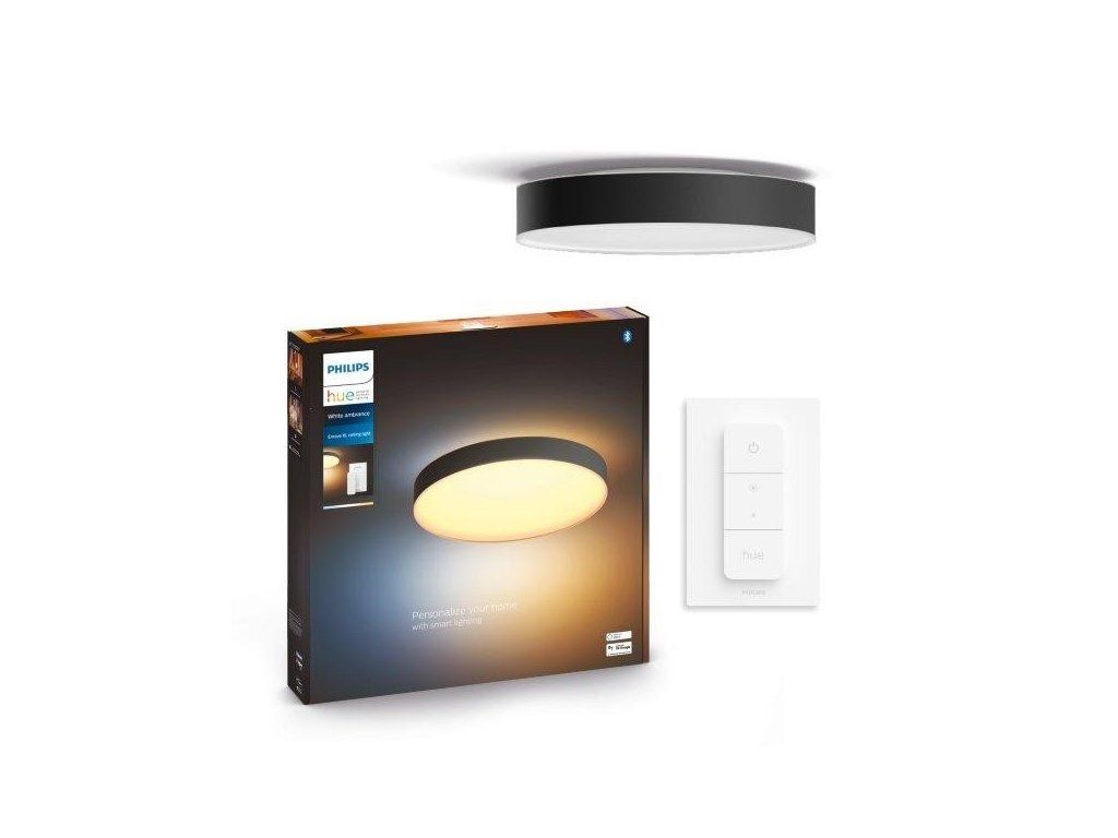 Stropní svítidlo Philips Hue Enrave značky Philips z rodiny Enrave je dostupné ve 2 barvách – bílá a černá. Svítidlo s kruhovou základnou i rám svítidla o průměru 55cm je vyrobeno z kvalitního kovu. Difuzor je z odolného bílého plastu a skrývá integrovaný LED zdroj s příkonem 33,5W a inteligentní technologií Hue White Ambiance, díky které lze nastavit barvu světla od 2200K (teplé žluté světlo) do 6500K (studené bílé světlo). Celkový výkon svítidla je 4300 lm. Svítidlo lze ovládat pomocí technologie Bluetooth. Stačí si stáhnout Bluetooth aplikaci, do které lze přidat až 10 inteligentních světel a ovládat je pouhým stisknutím tlačítka na Vašem mobilním zařízení. Svítidlo je rovněž okamžitě funkční s přiloženým bezdrátovým stmívačem Switch Dimmer. Stmívač můžete buď namontovat na zeď, nebo jej držet v ruce jako dálkový ovladač. Svítidlo můžete integrovat do osvětlovacího systému Hue zařízením Hue Bridge (prodává se samostatně) a můžete si vychutnat kompletní nabídku funkcí řady Philips Hue. Zařízení Hue Bridge vám umožní přidat až 50 inteligentních svítidel, které můžete ovládat v celé domácnosti.