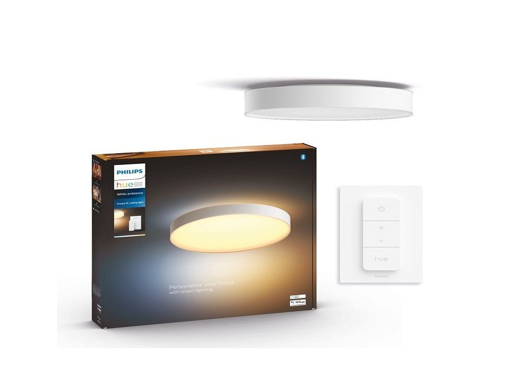 Stropní svítidlo Philips Hue Enrave značky Philips z rodiny Enrave je dostupné ve 2 barvách – bílá a černá. Svítidlo s kruhovou základnou i rám svítidla o průměru 55cm je vyrobeno z kvalitního kovu. Difuzor je z odolného bílého plastu a skrývá integrovaný LED zdroj s příkonem 33,5W a inteligentní technologií Hue White Ambiance, díky které lze nastavit barvu světla od 2200K (teplé žluté světlo) do 6500K (studené bílé světlo). Celkový výkon svítidla je 4300 lm.Svítidlo lze ovládat pomocí technologie Bluetooth. Stačí si stáhnout Bluetooth aplikaci, do které lze přidat až 10 inteligentních světel a ovládat je pouhým stisknutím tlačítka na Vašem mobilním zařízení. Svítidlo je rovněž okamžitě funkční s přiloženým bezdrátovým stmívačem Switch Dimmer. Stmívač můžete buď namontovat na zeď, nebo jej držet v ruce jako dálkový ovladač. Svítidlo můžete integrovat do osvětlovacího systému Hue zařízením Hue Bridge (prodává se samostatně) a můžete si vychutnat kompletní nabídku funkcí řady Philips Hue. Zařízení Hue Bridge vám umožní přidat až 50 inteligentních svítidel, které můžete ovládat v celé domácnosti.