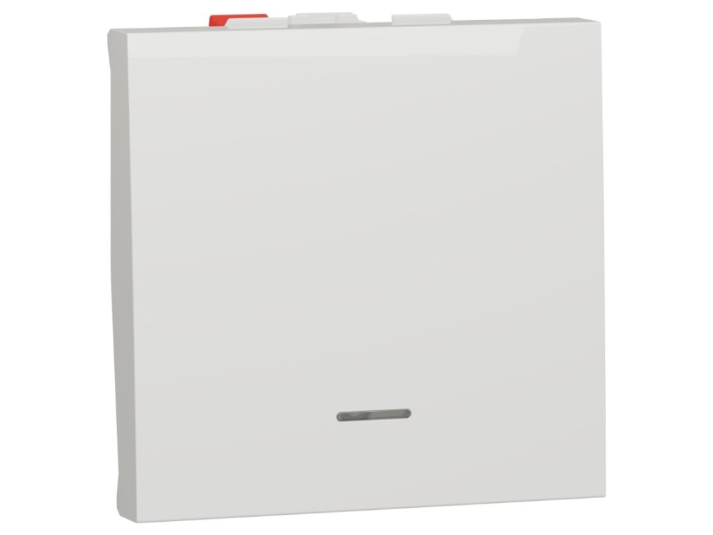 Bílé tlačítko č. 1/0 s orientační kontrolkou od společnosti Schneider Electric a z řady Nová Unica poskytuje snadné zapojení na bezšroubové svorky a klasický nekomplikovaný design, který je vhodný do každého interiéru.