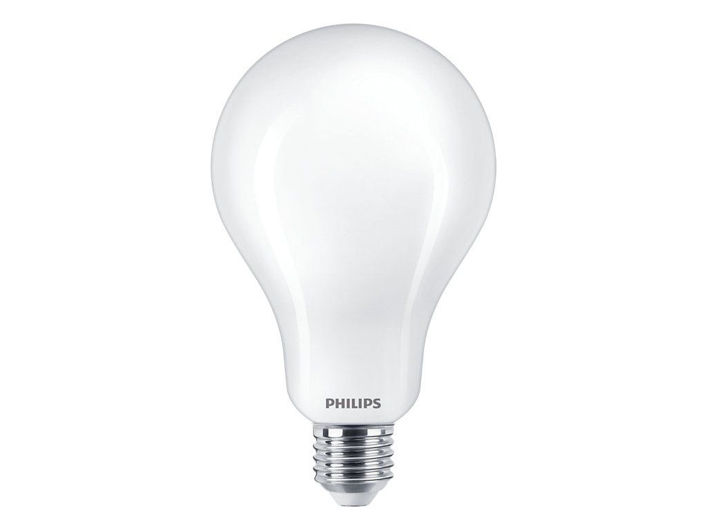 LED žárovka Philips Classic s paticí E27 ve tvaru baňky A95 v matné bílé variantě FR o příkonu 23 W, která nahrazuje klasickou 200 W žárovku, svítí příjemně rozptýleným úsporným teplým bílým světlem 2700 K se silným světelným tokem 3452 lm.