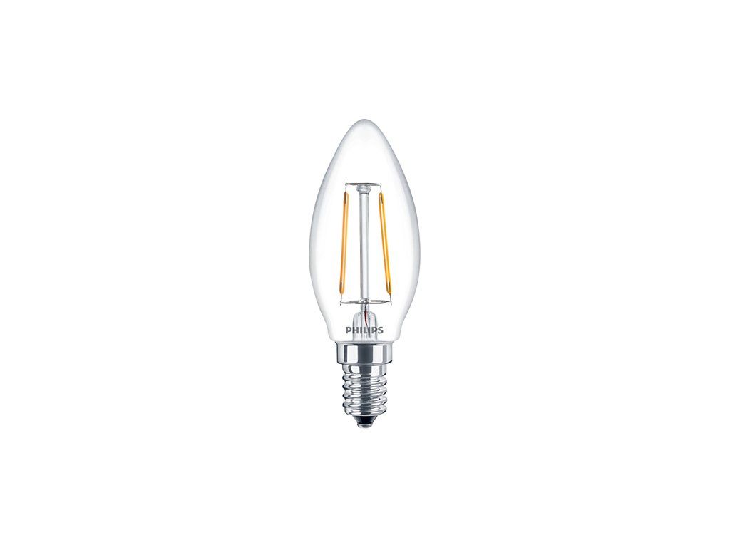 LED žárovka Philips Classic filament s paticí E14 ve svíčkovém tvaru baňky B35 v průhledné variantě o příkonu 2W, která nahrazuje klasickou 25 W žárovku, svítí úsporným teplým bílým světlem 2700 K se světelným tokem 250 lm.