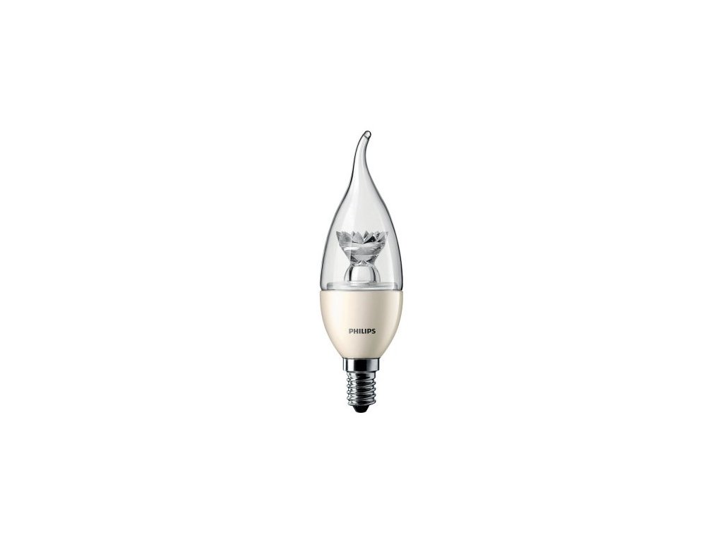 LED žárovka Philips MASTER s paticí E14 ve svíčkovém tvaru baňky BA39 v průhledné variantě o příkonu 3 W, která nahrazuje klasickou 25 W žárovku, svítí úsporným teplým bílým světlem 2700 K se světelným tokem 250 lm.