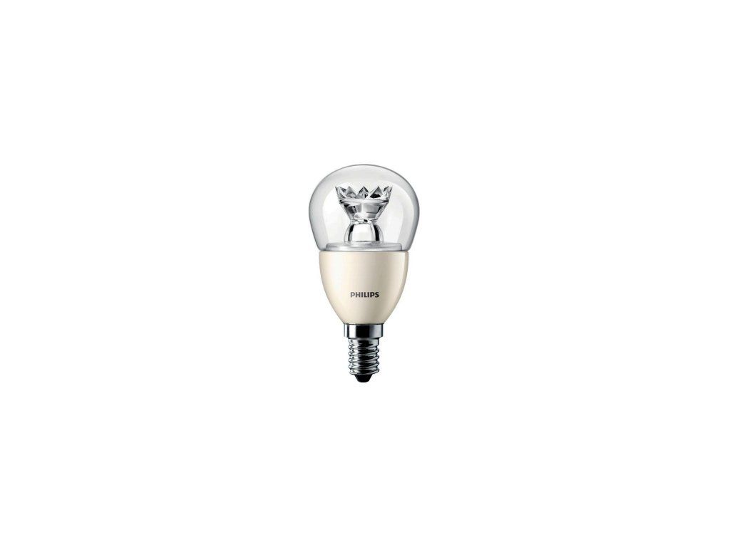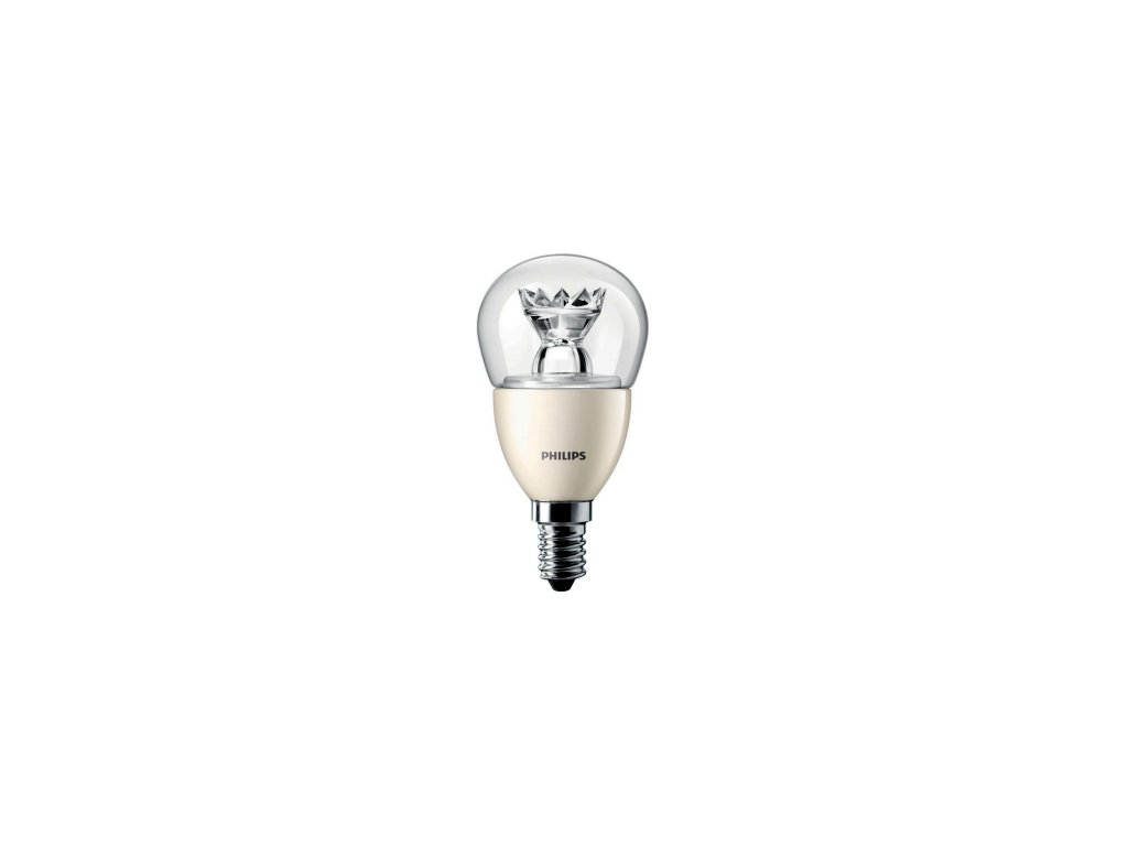 LED žárovka Philips MASTER luster s paticí E14 ve tvaru baňky P48 v průhledné variantě o příkonu 3,5 W, která nahrazuje klasickou 25 W žárovku, svítí stmívatelným úsporným teplým bílým světlem 2700 K se světelným tokem 250 lm.