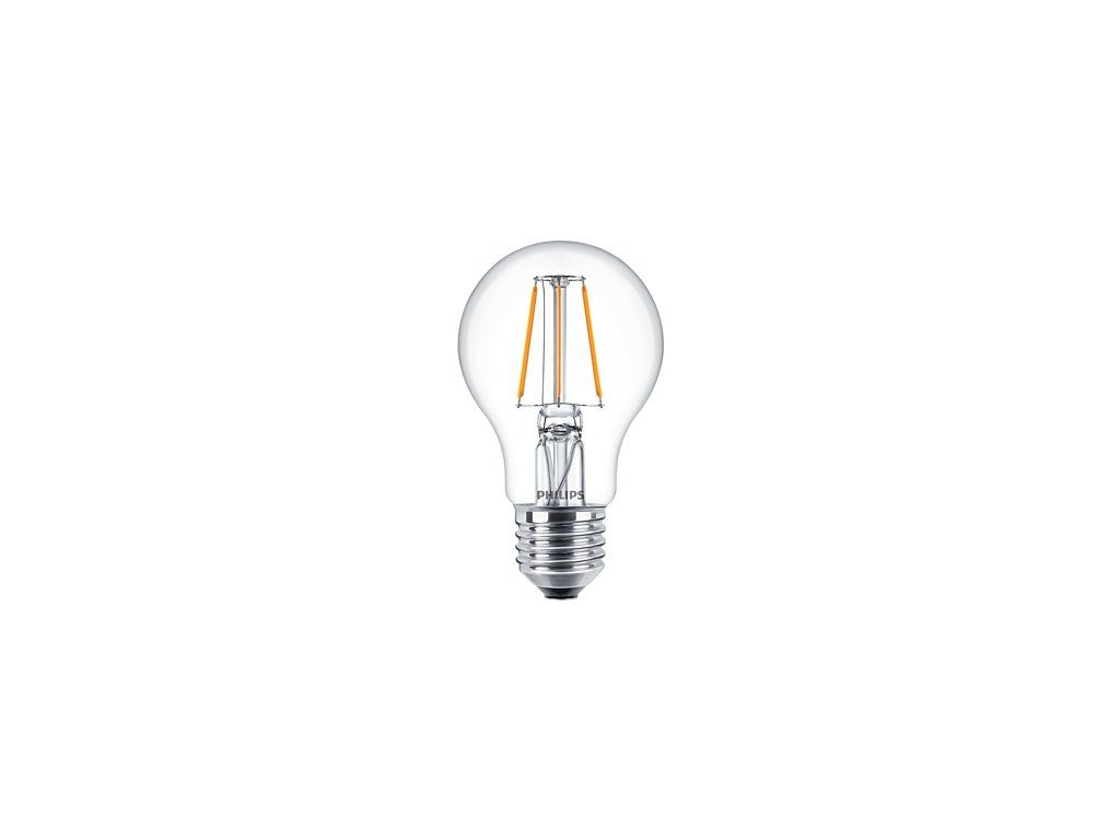 LED žárovka Philips Classic filament s paticí E27 v tradičním tvaru baňky A60 v průhledné variantě o příkonu 4,3 W, která nahrazuje klasickou 40 W žárovku, svítí příjemně rozptýleným úsporným teplým bílým světlem 2700 K se světelným tokem 470 lm.