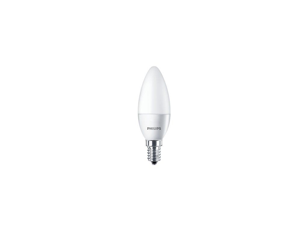 LED žárovka Philips CorePro s paticí E14 ve svíčkové baňce B35 v matné bílé variantě FR o příkonu 5 W, která nahrazuje klasickou 40 W žárovku, svítí příjemně rozptýleným úsporným teplým bílým světlem 2700 K se světelným tokem 470 lm.