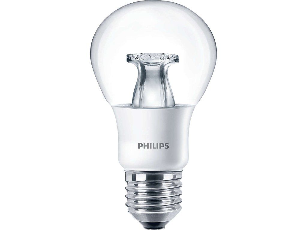 LED žárovka Philips CorePro s paticí E27 v tradičním tvaru baňky A60 v průhledné variantě o příkonu 6,5 W, která nahrazuje klasickou 40 W žárovku, svítí příjemně rozptýleným úsporným teplým bílým světlem 2700 K se světelným tokem 470 lm.
