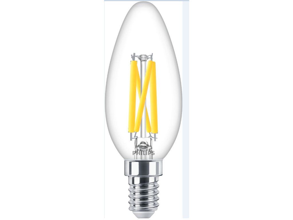Úsporná LED žárovka E14 Philips MASTER GLASS LEDCandle 5,9W tvaru svíčka vyzařuje teplé bílé světlo. Disponuje funkcí DimTone, díky které můžete žárovku stmívat, regulovat na různé úrovně světelného toku a také různé teploty chromatičnosti 2 200 – 2 700 K. Životnost LED stmívací žárovky se pohybuje na úrovni 25 000 hod. LED žárovka E14 poskytuje též vynikající kvalitu světla, index podání barev činí Ra: 90.Doplňkové parametry