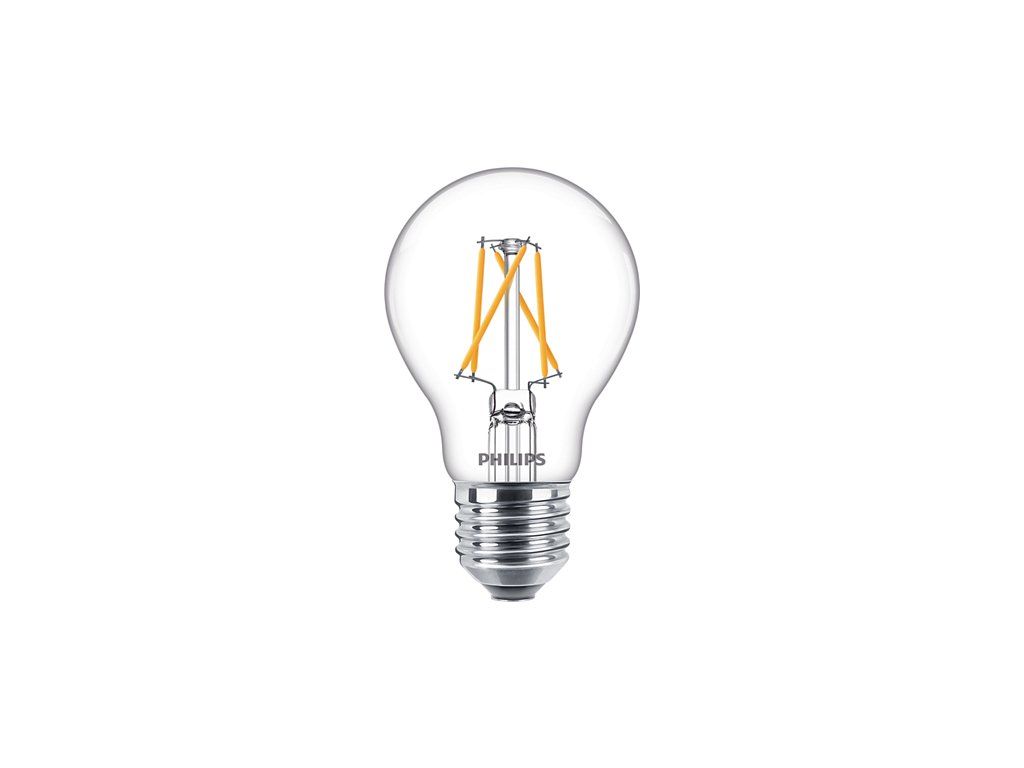 LED žárovka Philips SceneSwitch s paticí E27 ve tvaru baňky v průhledné variantě o příkonu 7,5 W, která v různých režimech nahrazuje klasické žárovky 60 W/30 W/16 W, svítí úsporným teplým bílým světlem ve variantách 2700/2500/2200 K se světelnými toky 806/320/150 lm.