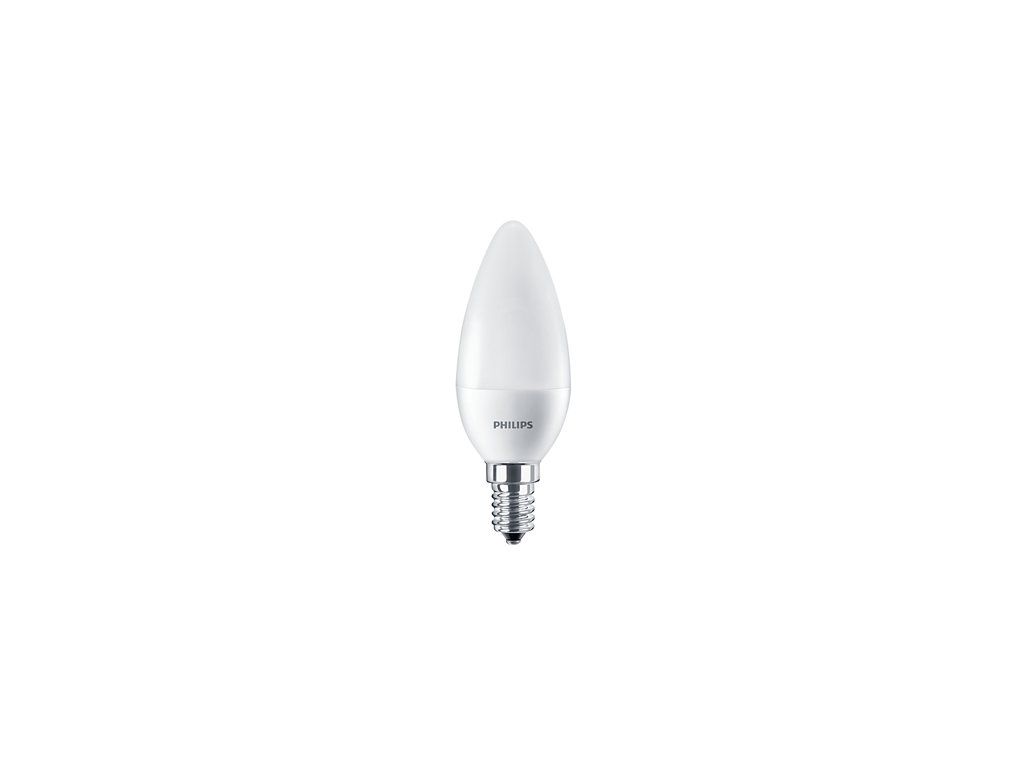 LED žárovka Philips CorePro s paticí E14 ve tvaru svíčka B38 v opálově bílé variantě o příkonu 7 W, která nahrazuje klasickou 60 W žárovku, svítí příjemně rozptýleným teplým bílým světlem 2700 K se světelným tokem 806 lm.