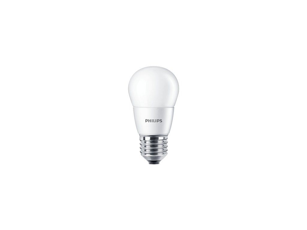 LED žárovka Philips CorePro s paticí E27 ve tvaru baňky P48 v matné bílé variantě FR o příkonu 7 W, která nahrazuje klasickou 60 W žárovku, svítí příjemně rozptýleným úsporným teplým bílým světlem 2700 K se světelným tokem 806 lm.