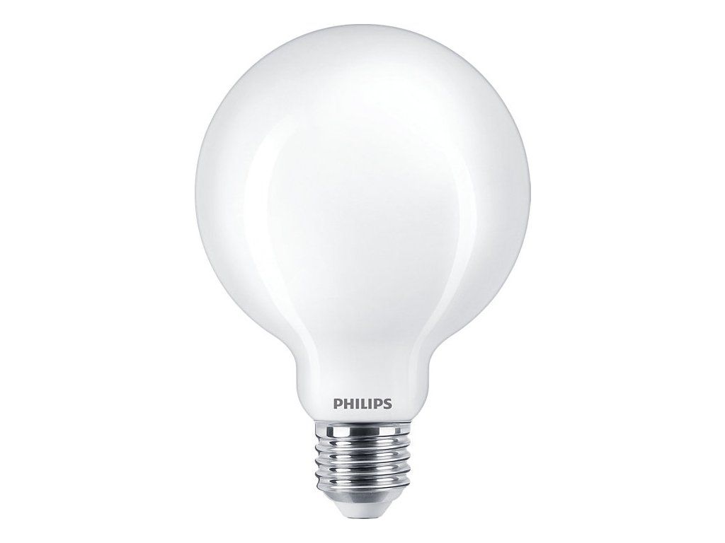 LED žárovka Philips Classic LEDbulb s paticí E27 a velkou matně bílou baňkou FR ve tvaru globe G93 o příkonu 7 W je náhradou 60 W obyčejné mléčné žárovky. Má rozptýlené příjemné teplé bílé světlo 2700 K se světelným tokem 806 lm, které nelze stmívat.