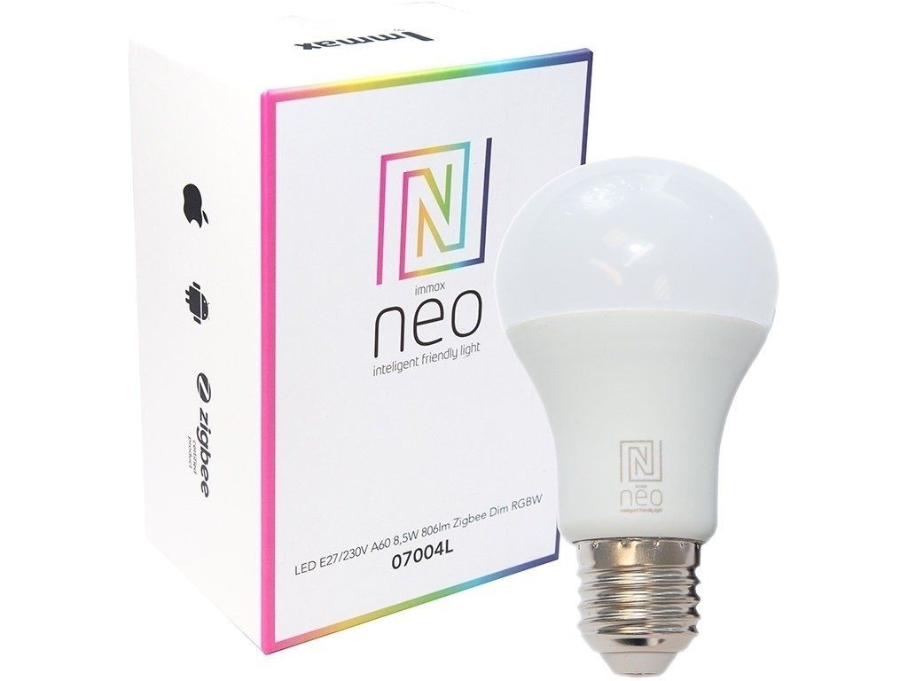 Inteligentní žárovka Immax Neo E27 RGBW promění každé stávající svítidlo v inteligentní prvek moderní domácnosti. Patice E27 se nejčastěji objevuje v lustrech, nástěnných lampách či ve stojacích lampách. Žárovka vydává teple bílé světlo a umožňuje volbu ze 16 milionů barev světla. Je také stmívatelná. Funce žárovky můžete ovládat pomocí dálkového ovládání a nebo za pomoci mobilního telefonu či tabletu. Stačí pouze žárovku spárovat s inteligentní bránou Immax NEO a stáhnout si mobilní aplikaci.Doplňkové parametry
