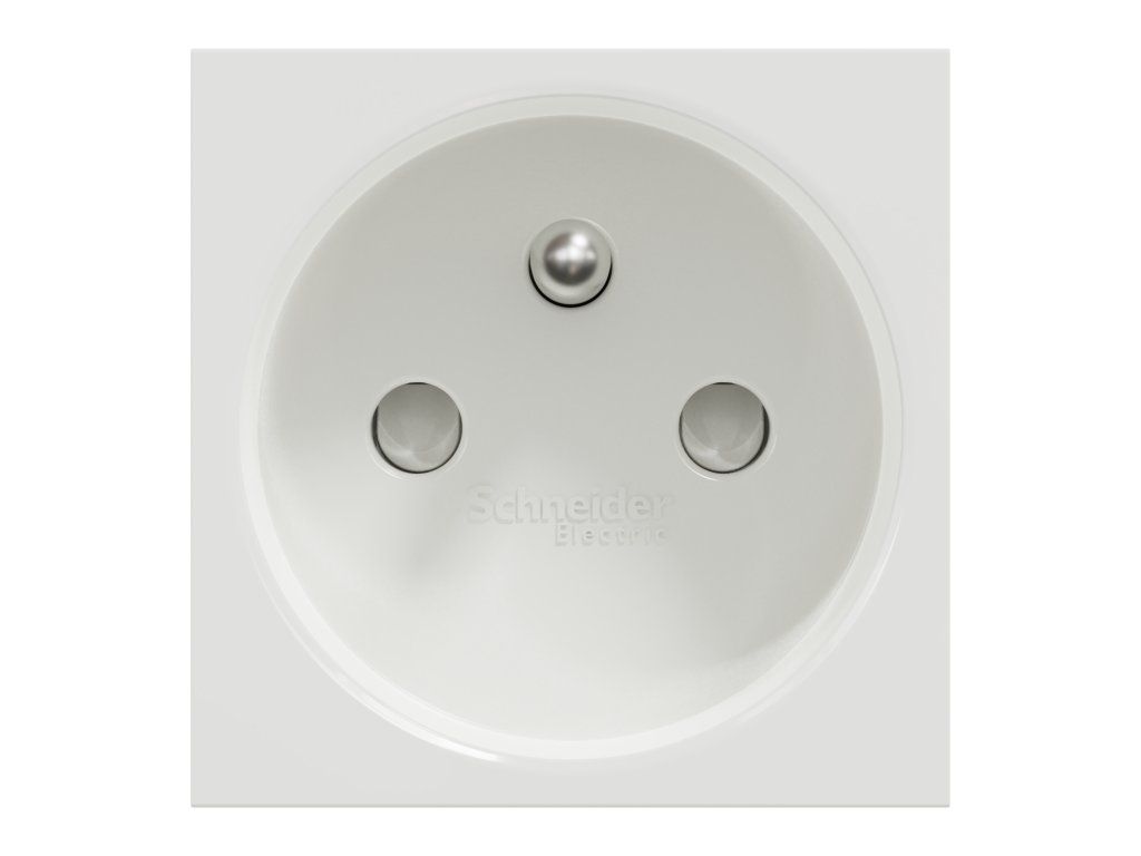 Zásuvka Schneider Electric Nová Unica. Zásuvka má šroubové připojení vodičů, zemnící kolík a ochranné clonky. Barevné provedení zásuvky je bílá barva.