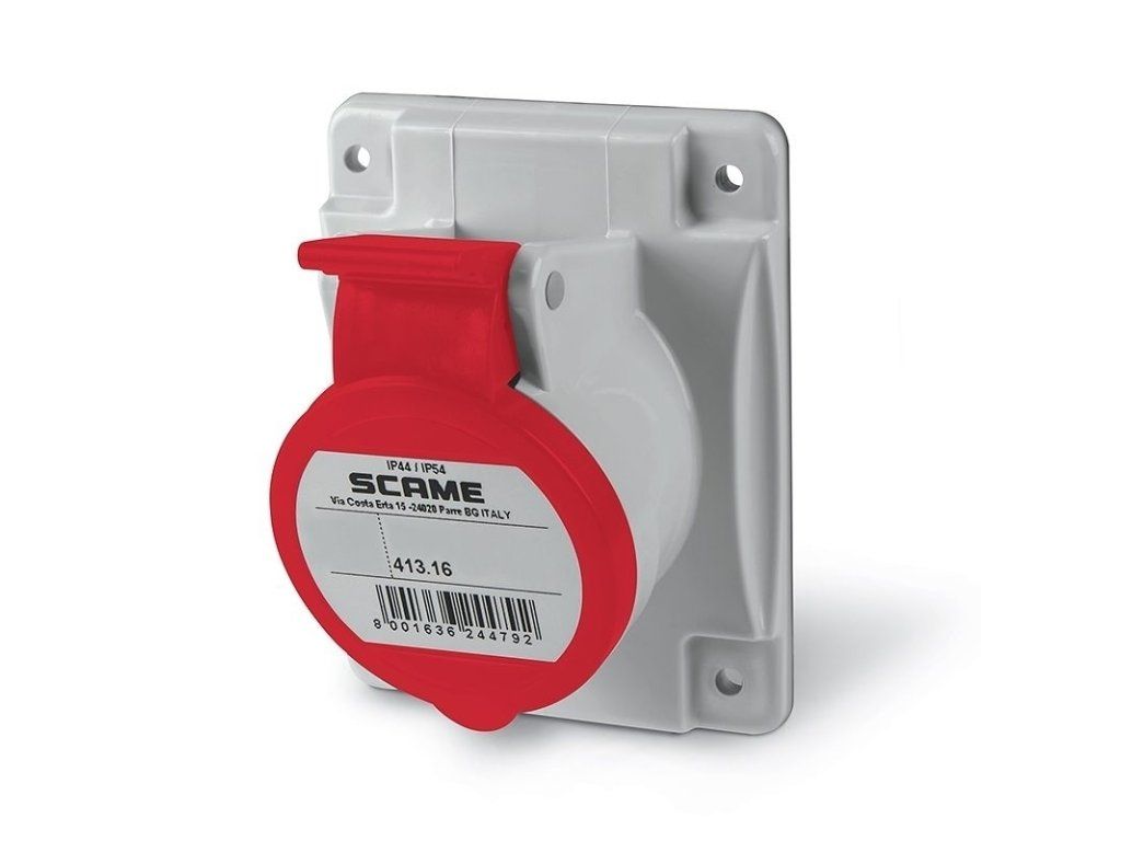 Vestavná zásuvka SCAME OPTIMA do zás. rozvodnic, nebo do panelu, šikmá - 3P+E, 16A, 6h/380-415V (400V), 50/60Hz, IP44 (rozměr příruby: 70x87mm).Doplňkové parametry
